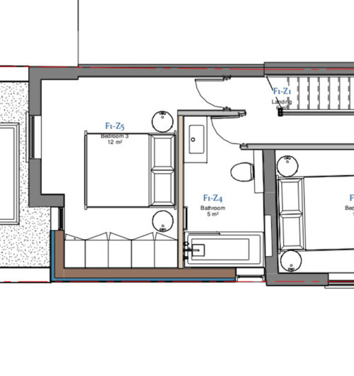 Splitting into two bathrooms is quite tight, meaning that would need to have a small bathtub (1300mm) but we think having one large bathroom may not be a great use of space. Having 2 bathrooms would make morning routines and guest visits easier (half our family is not in the UK).