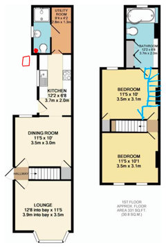 A modest budget, with the following wishlist. We won't be moving anytime soon, but I do want to consider what future owners would prefer. I'd love a side return and we might be able to find money for that in the future, so I don't want to do anything that would mean undoing work. Soil pipe is the red circle and there is an inspection chamber where red rectangle is. There is a loft conversion too, with the stairs in blue - there is space under the stairs in the middle bedroom. We are in London. Right, the wishlist!