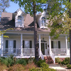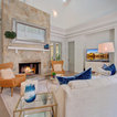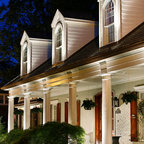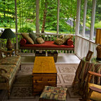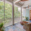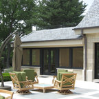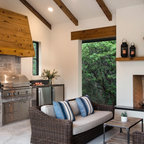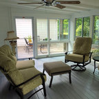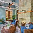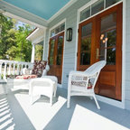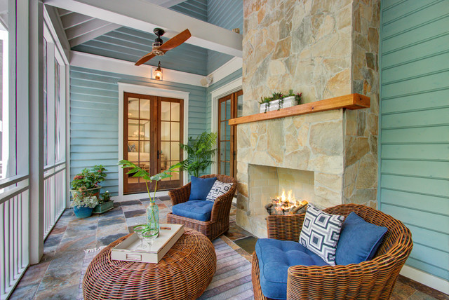 Photo of a classic veranda in Charleston with a fire feature, natural stone paving and a roof extension. — Houzz