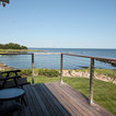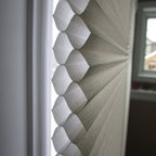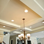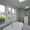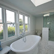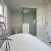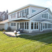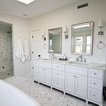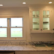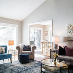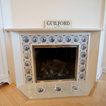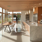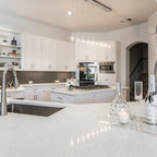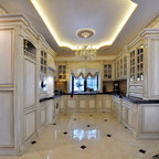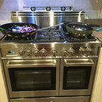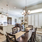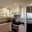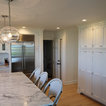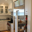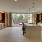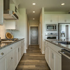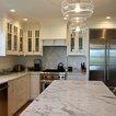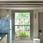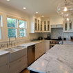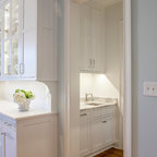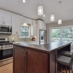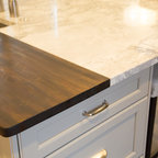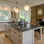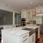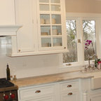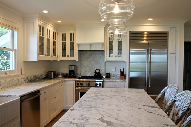 Inspiration for a medium sized traditional l-shaped kitchen/diner in Bridgeport with a belfast sink, shaker cabinets, white cabinets, multi-coloured splashback, stainless steel appliances, light hardwood flooring, an island, brown floors and multicoloured worktops. — Houzz