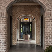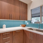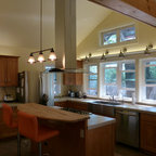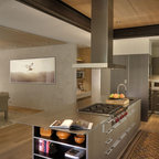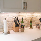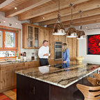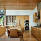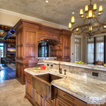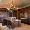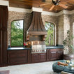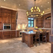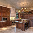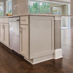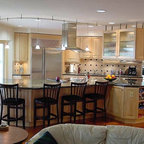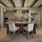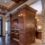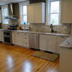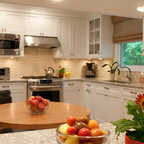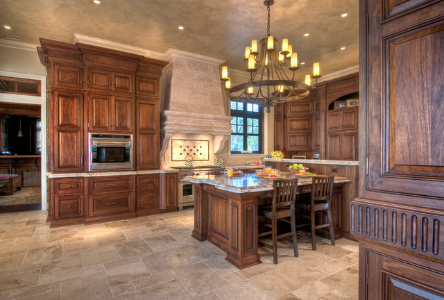 Design ideas for a large classic u-shaped kitchen in Charleston with a belfast sink, raised-panel cabinets, medium wood cabinets, granite worktops, beige splashback, ceramic splashback, stainless steel appliances and limestone flooring. — Houzz