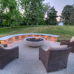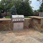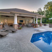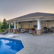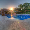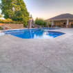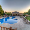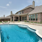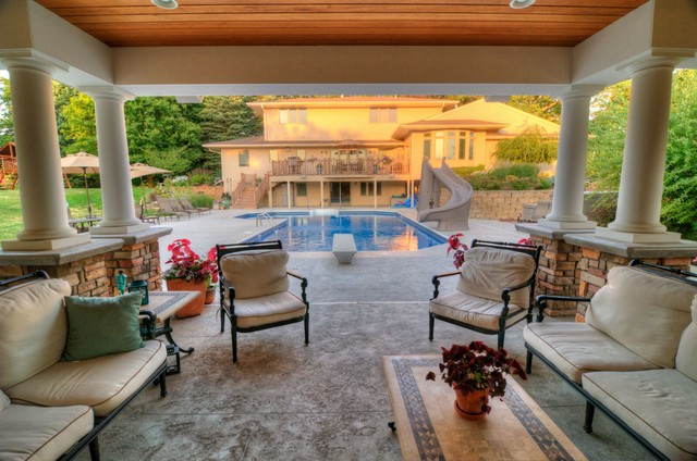 Large classic back custom shaped natural swimming pool in Cedar Rapids with a water slide and stamped concrete. — Houzz