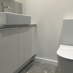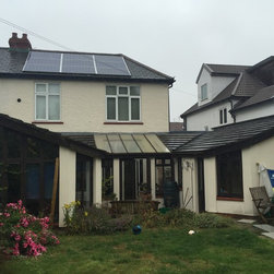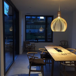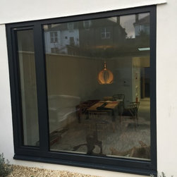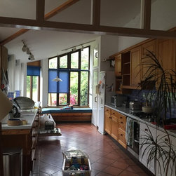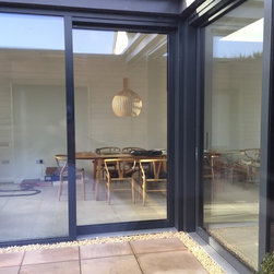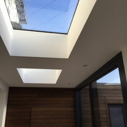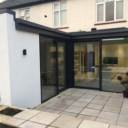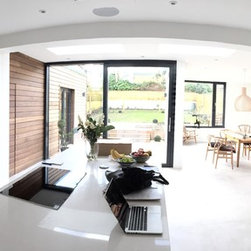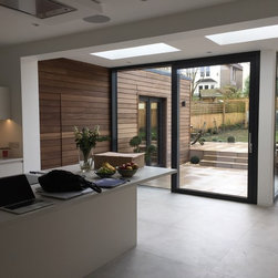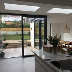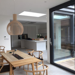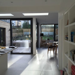 Rebuilding existing extensions to provide more modern appearance to semi-detached house in Westbury Park, Bristol. Flat roof construction featuring large rooflights. Internal remodelling to provide generous kitchen dining space, with inclusion of separate study and utility. Additional extension to provide garage/bike store.
