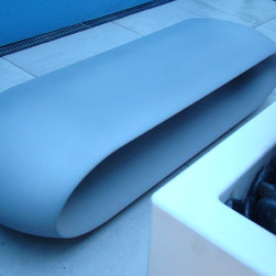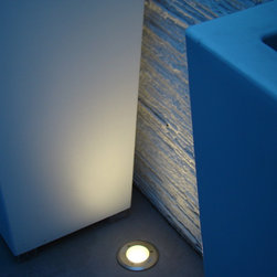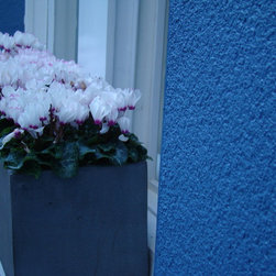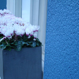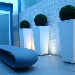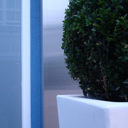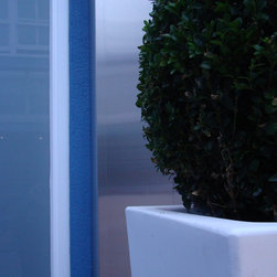 Design Process: In small spaces texture and theater play a central role. Large containers were brought to contrast with the textured white walls. A polished stainless steel structure was designed to hide the pipes. The bench works as a sculpture and also as a focal point in the garden. Buxus sempervirens were planted in the containers and in the windowsill a large window box were planted with white cyclamen . In the evening the garden is as its best with the lights uplighting the containers against the wall.