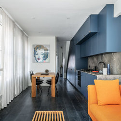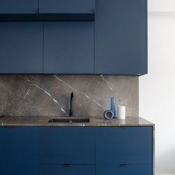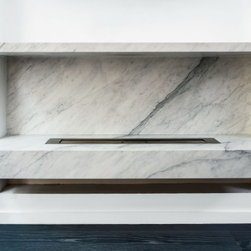 The combination of bold colours and strong materials result in an interior space with modernist influences yet sombre and elegant and where the statuario marble fireplace becomes an opulent centrepiece with a minimal design.