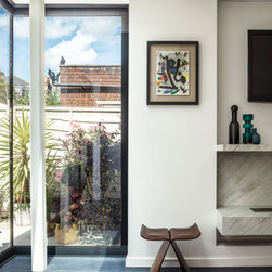 The rooms within the outrigger have been opened up and the former extension rebuilt with a higher flat roof, punctured by an elongated light well. The corner glazing directs one’s view towards the sleek limestone garden.