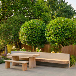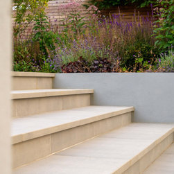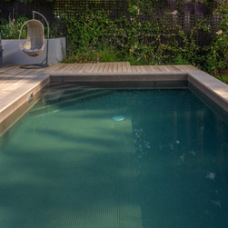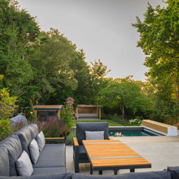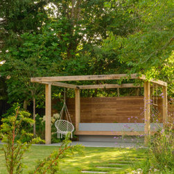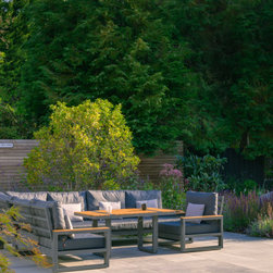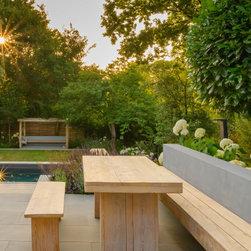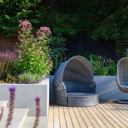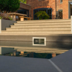 A garden in three levels. the first the patio around the house with grey accessories and furniture. the second area the infinity swimming pool surrounded by retaining walls and low planting and the third area is the lawn area with a pergola at the end working as a focal point.