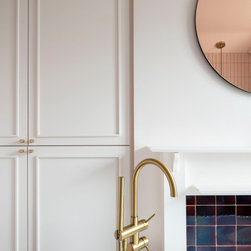 At the front, much of the original character has been preserved, including the original stairwell, balustrade, and tiled fireplaces, all of which celebrate the home’s Victorian heritage. The drawing rooms have been thoughtfully opened up and connected with large bifolding doors, creating a flexible layout that allows for both separation and visual flow. A mirrored design of floating shelves, bypassing the chimney breasts, frames the fireplaces while reinforcing the sense of continuity between the two rooms. This enhances the interplay between old and new, respecting the home’s history while introducing modern functionality.