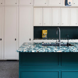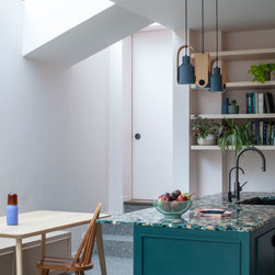 A palette of soft pastel tones—delicate pinks and buttery yellows—unifies the front and rear of the house, creating a harmonious flow through the spaces. This subtle colour scheme is boldly contrasted by the kitchen island, finished in a deep green and topped with a striking multi-coloured terrazzo worktop, adding a playful vibrancy.