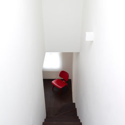 From the intentionally darkened entrance lobby at the lower ground floor – as seen in Mackintosh’s Hill House – one is led to a brighter upper level where the insertion of wide pivot doors creates a flexible open plan centred around an unfinished plaster box-like pod. Kitchen and living room are connected and use a stair balustrade that doubles as a bench seat; this allows the landing to become an extension of the kitchen/dining area - rather than being merely circulation space – with a new external view towards the landscaped terrace at the rear.