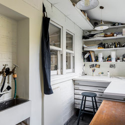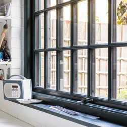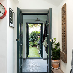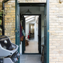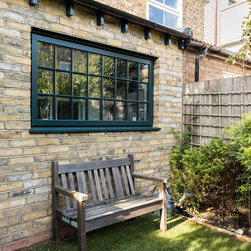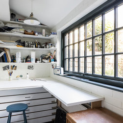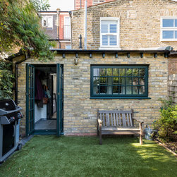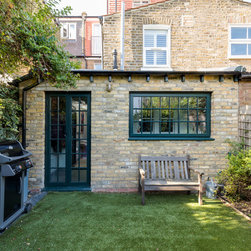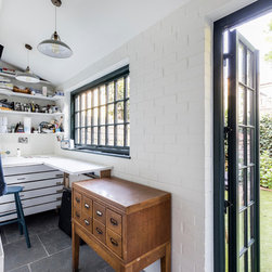 This was a truly unique project for our team, the client wanted a space that would inspire and allow him to create a masterpiece. Our team created a small rear extension with a pitched roof. We channelled our client's style and used bespoke hardwood industrial style windows and french doors. The interior was augmented with exposed painted brick walls. The industrial chic wash basin, desk, shelves and sash windows helped to ensure we created a space which is both practical and stylish.