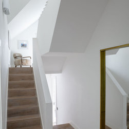 The forms of the extended volumes, the lower nearest to the boundary and the higher adjacent to it, are generated by the application of the Permitted Development rules and further emphasised by the insertion of vertical and horizontal structural members, marking the transition between the two volumes.