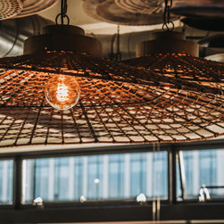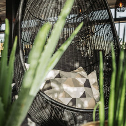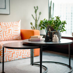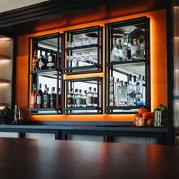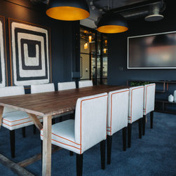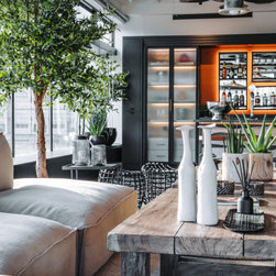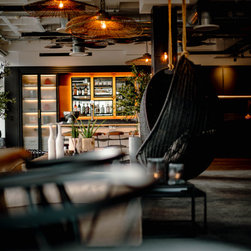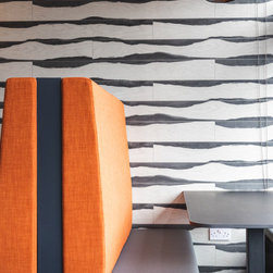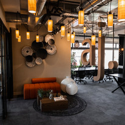 Aspects of the companies logo colour, orange, were incorporated into the design scheme, noticeably in the furniture and the wallpaper behind the bar shelving unit. The sitting area contains black rattan hanging chairs that have become one of the favourite areas for our clients. A life sized AJ logo hangs from the ceiling upon entering the building, along with spider lighting and a low height coffee table to create a spacious, inviting and professional feel.