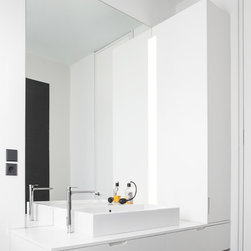 A traditional oak flooring, stained dark to counterbalance the lightness of the walls and the integrated furniture, is used throughout to hold the different volumes together.