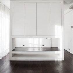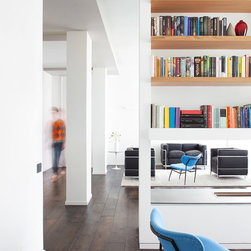 A large monolithic structure is employed to introduce a degree of separation between Living Room and Study and an oversized opening, cut into it, allows a visual connection between the two areas. A flueless fireplace is surmounted by a large TV cabinet on one side, and bookshelves facing the Study.