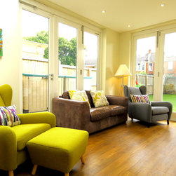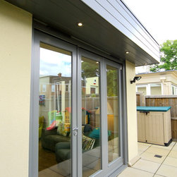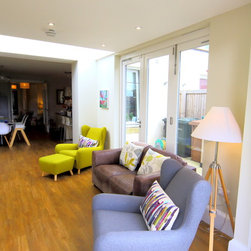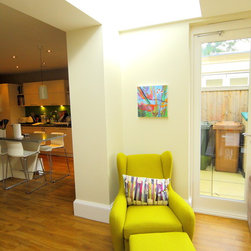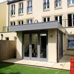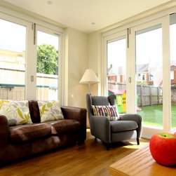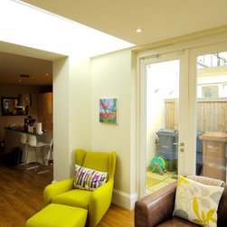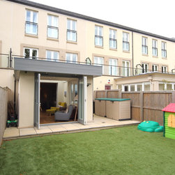 A flat roof modern looking extension with bifolding external doors on two elevations. Glazing roof light at the join to the house wall creates a beautiful light well internally. A modern extension look for a modern townhouse.