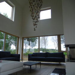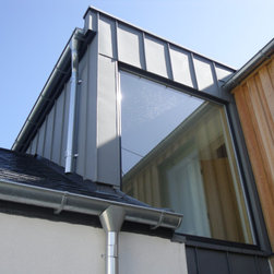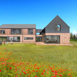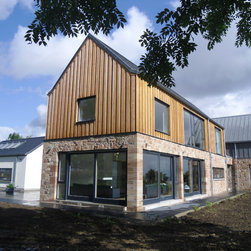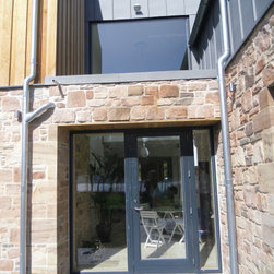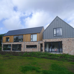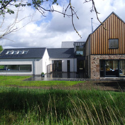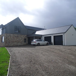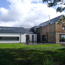 The material palette was carefully chosen to reflect the rural setting with the use of render, natural stone, slate and untreated vertical larch cladding. Contemporary detailing, large format glazing and zinc cladding have been used to give the house a modern edge.