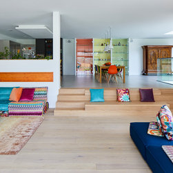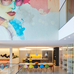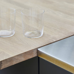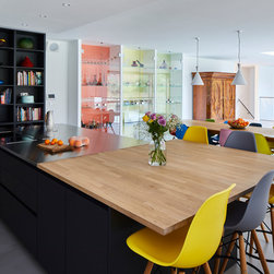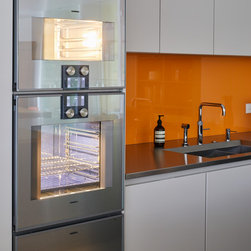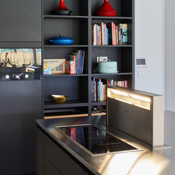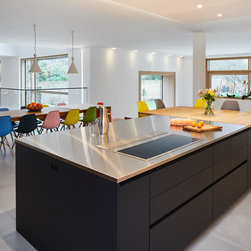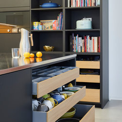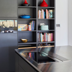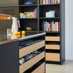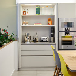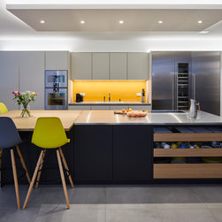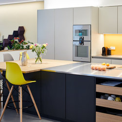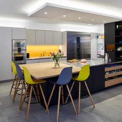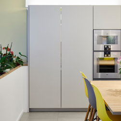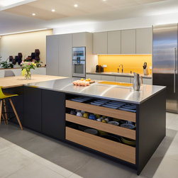 A perfect balance of materials, technology and colour. Matte, handleless units perfectly balance the light, bespoke breakfast bar and open drawer units. Gaggenau appliances add a true sense of luxury, fitting seamlessly with the stainless steel surfaces to give a clean, modern feel.