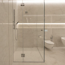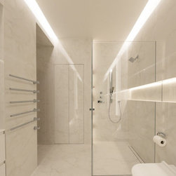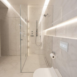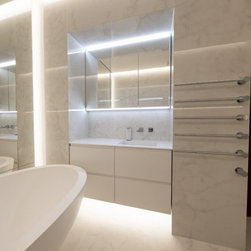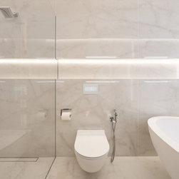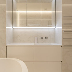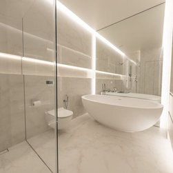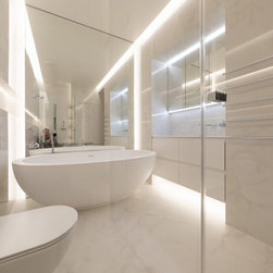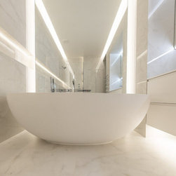 This bathroom, complete with a bathtub, exudes a sophisticated hotel vibe, offering an elegant and aesthetic experience. Inspired by the luxurious ambiance found in high-end London establishments, it features impeccable design elements and great lighting, creating a space that is both visually pleasing and indulgent.