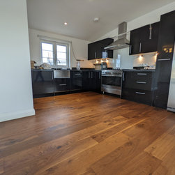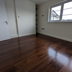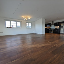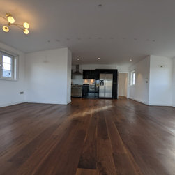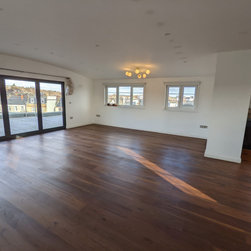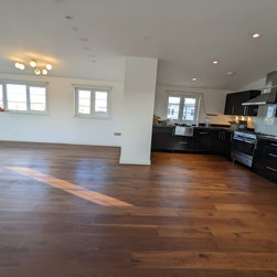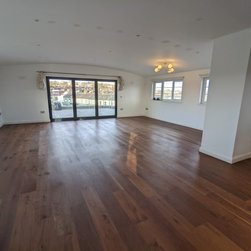 This project took place in an attractive 1930s art deco block of flats in the new penthouse apartment added in more recent years. The penthouse apartment boasts ample space, abundant natural light, and a contemporary ambiance. The property featured an existing walnut wooden floor in the hallway and the expansive open plan kitchen living area. The objective of this project was to sand and restore the old walnut floors to reintroduce the richness, colour, and warmth of walnut and expertly match and provide new walnut boards for the bedrooms introducing the same richness and warmth throughout the entire property.