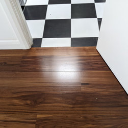 The new boards were of a higher grade than the original floor. They did not have any distracting yellow sapwood. There was previously a disturbing dissonance between the rich dark walnut and yellow sap patches that we set about to improve. We sanded and stained the existing boards to darken the sap wood and reduce the noticeable difference.