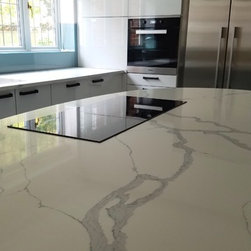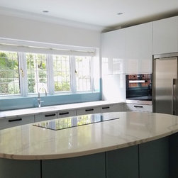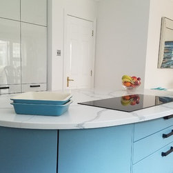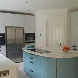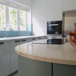 A simple contemporary kitchen with an eyecatching elliptical island and marble effect quartz.