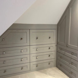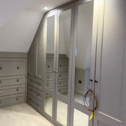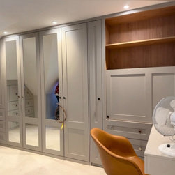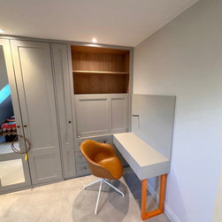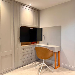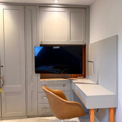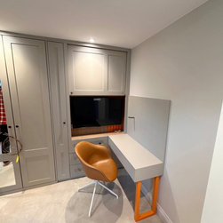 Discover our latest creation: a large, custom spray-painted angled wardrobe. It features plenty of drawers, a hidden trousers press, and a TV that can be tucked away behind a door. The design includes a workspace, all in a sleek grey with standout orange details. Perfect for adding both style and function to your home.