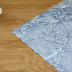 A beautiful refined bespoke shaker kitchen painted in Farrow & Ball Pavilion Grey around the walls and Downpipe on the island. The worktops are in stunning Bianca Eclipsia quartzite stone with a circular oak veneered breakfast bar.