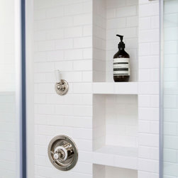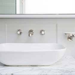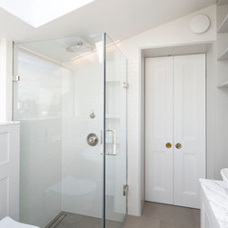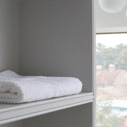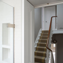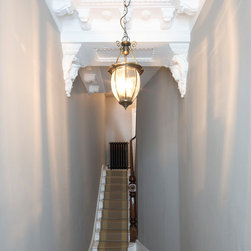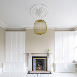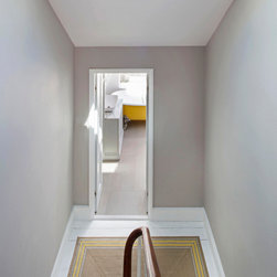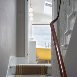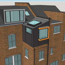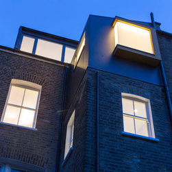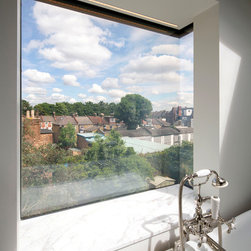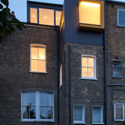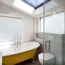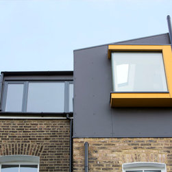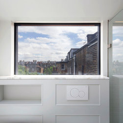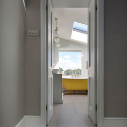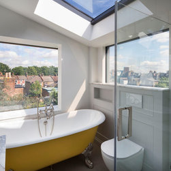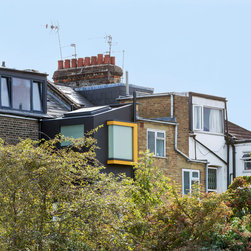 Perched atop a Victorian rear extension a modern black addition with projecting yellow oriel window houses a new bathroom that cleverly juxtaposes contemporary architecture with classical interior features.