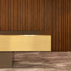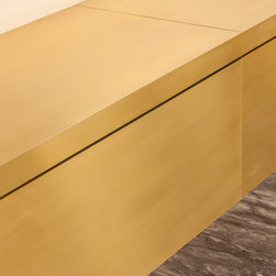 A wall fixed brushed brass unit also available in polished. Can be made in patinated bronze or copper. Can also be made with cupboards instead of drawers. Modular so can be made any length. Can be supplied with glass protective top. Please enquire for accurate cost.