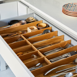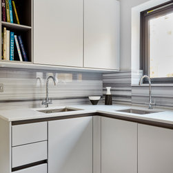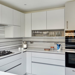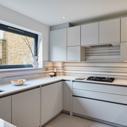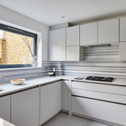 A compact contemporary kitchen in a pale grey with a stunning natural equator marble splash back.