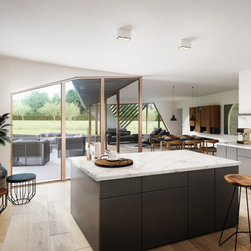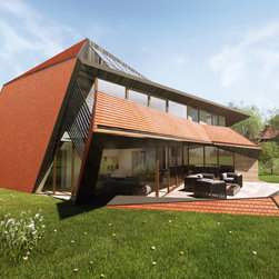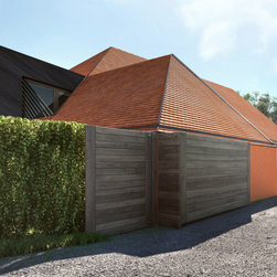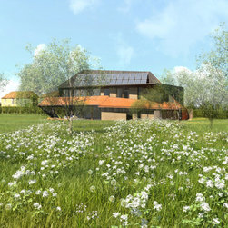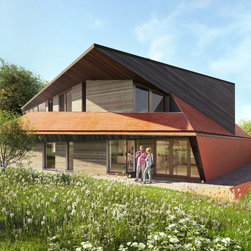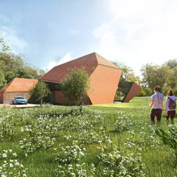 Seen from the road on the north side, the form of this Para 79 dwelling is simple and reminiscent of a peg tiled agricultural barn, with a twist ! Moving around to the south side the carefully sculpted angles create drama and cleverly resolve the inside and outside spaces as well as opening up the building to south facing sun for free winter heating.