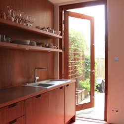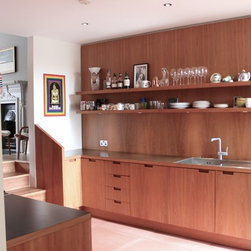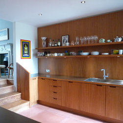 Kitchen view to front reception. Bespoke cherry wood wall panels and cabinets and custom made large concrete floor tiles.