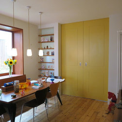 Shelves and yellow sliding door dividing rear reception and dining room