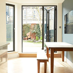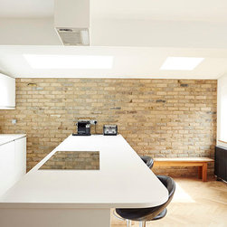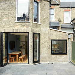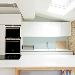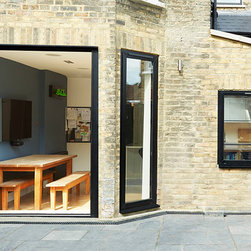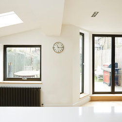 The extended kitchen/ living area has been configured to provide distinct zones for the kitchen, dining area and living space. Views and access to the rear garden are improved and daylight is brought into the deepest part of the plan (where the kitchen is located) with wide format flush fitting roof lights. The galley kitchen provides a vantage point across the open plan space and into the garden, with dining and living spaces benefitting from direct views and access to the garden.