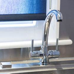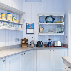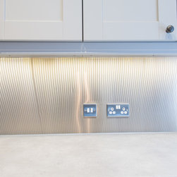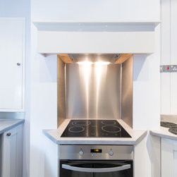 Stylish painted kitchen in subtle shades of grey. This traditional shaker style kitchen fitted beautifully into the awkward shapes of this room. The stainless steel splashback provided a stunning contrast in materials and made this cook's kitchen easy to clean.