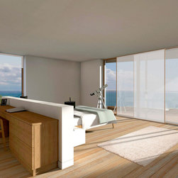 The curved form allows the bedroom to achieve optimum views of the sea and morning light whereas the kitchen and dining spaces receive the evening light. South facing garden nestles in the centre of this curve. Along the inside of the internal curve facade integrated 'solar wall’ provides warm air to be fed into the MVHR system, thus reducing the heating requirements of the house.