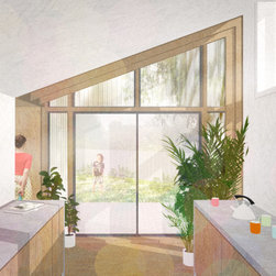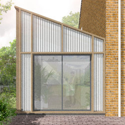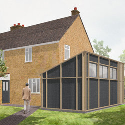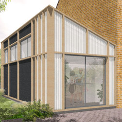 The single storey extension deliberately contrasts the form and current appearance of the existing house. The roof form is angled away from the house to provide large high level windows in order to maximised natural light internally. The extension continues the original idea of external structural expression but in timber. The new timber frame is expressed and celebrated, with black profiled steel cladding and polycarbonate glazing infilling between the timber frame to provide a cost effective but striking design.
