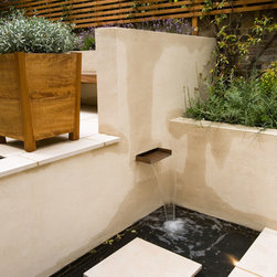 Charlotte Rowe Garden Design designed a cool, contemporary space on two levels using Portuguese limestone, lime-washed walls, bespoke timber benches, trellis and containers and a mix of raised beds, gravel and container planting. We pushed back substantially the upper level of the garden away from the house, creating two really good sized spacious areas. The central focus of the new garden is a stepping stone water feature filled with polished black pebbles with a simple copper water spout. This is complemented by a pebble and planted ‘rill’ running like a ribbon through the garden.