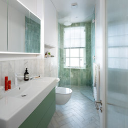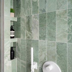 Welcome to our luxurious contemporary bathroom project, where tropical elegance meets modern sophistication. As you enter, the fluted glass door hints at the indulgent experience within, balancing sensuality with privacy. Inside, your eyes are immediately drawn to the free-floating green bespoke vanity and its mirrored cabinet, softly illuminated to create a modern ambiance. The focal point of the shower area is the vibrant green tropical twist marble tiles, bathed in natural light from the window, while discreet tiled drain seamlessly integrates functionality with aesthetics. Custom tiled niches in the shower provide practical storage for toiletries without compromising on the sleek design. Throughout the space, white brassware add a touch of refinement, complementing the lush greenery and warm lighting to transform this bathroom into a luxurious oasis of tranquillity and sophistication.