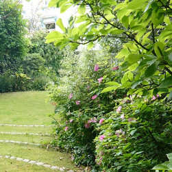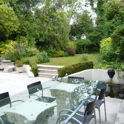 The design Process: Roberto created an open garden that could be view from the house. The patio area had new Indian sandstone installed and on the second level, two circular lawns. Between the lawn a series of circular row of granite sets created a pattern and integrated the two circles in one organic shape