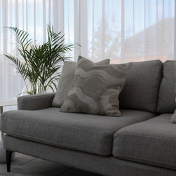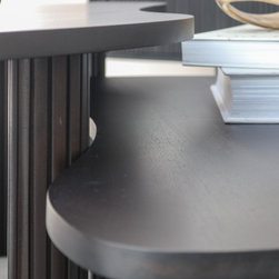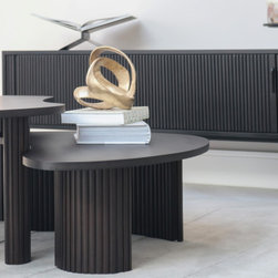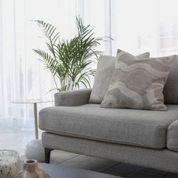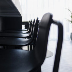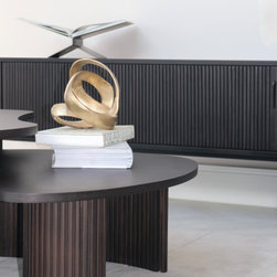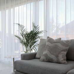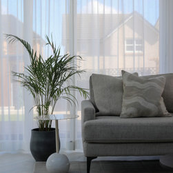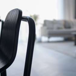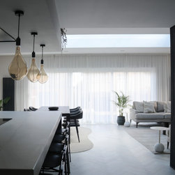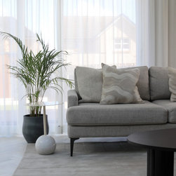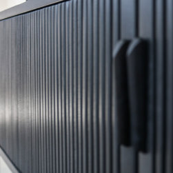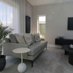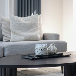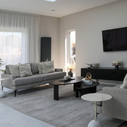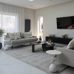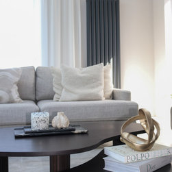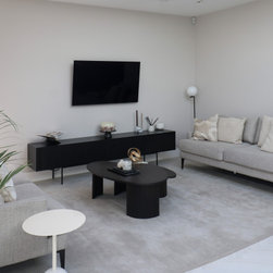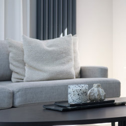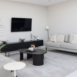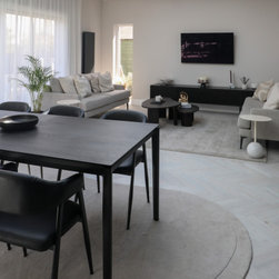 Explore an airy living space influenced by contemporary aesthetics, featuring a balance of light tones and dark wood elements. Subtle vertical accents unify the various areas of the room, while soft textures contribute to a cosy and welcoming atmosphere.