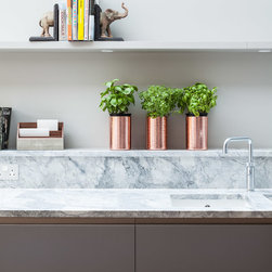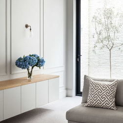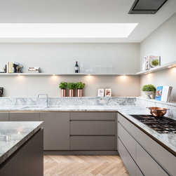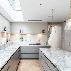 The kitchen is fitted with fully bespoke cabinetry and the soft grey tone complements the finishes of the floor and adds a contemporary feel to the project.