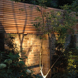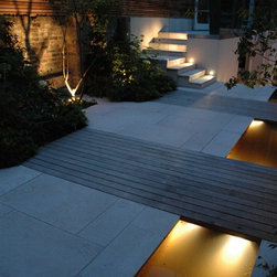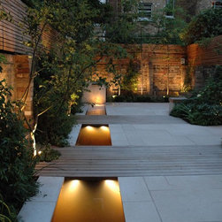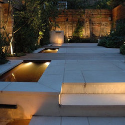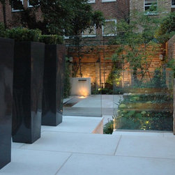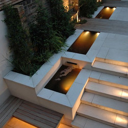 The focal point of the garden is a 10 metre long water rill with two copper spouts which is cut into the cream limestone paving and is bridged by two cedar decked pontoons. Set into the pontoons are two multi-stemmed specimen trees. The planting is low key and rhythmic with a rich green, cream and blue/purple palette. There is a row of dramatically uplit pleached Hornbeams at the far end of the garden which helps screen the view of the buildings beyond.