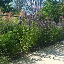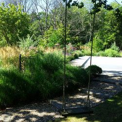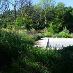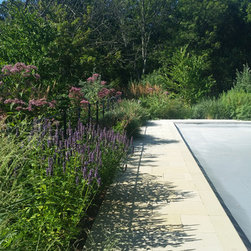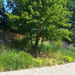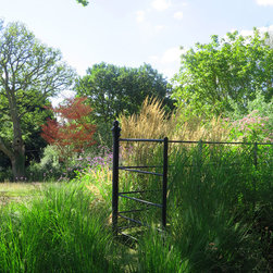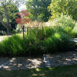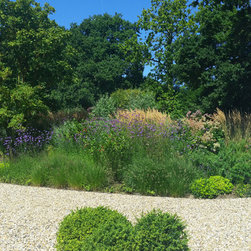 The deer and rabbits in this area of Hampshire are prolific and hungry so much of the colour comes from flowering shrubs such as Hydrangeas, Viburnums, Lilac, Witch Hazels, Euonymus and Black Elders. A large variety of ornamental grasses and a few deer proof perennials such as Hellebores, Euphorbias, Actaeas, large Eupatorium maculatum and Persicaria polymorpha make the transition from the meadow areas to the shrubs and woodland. The garden also sits on almost solid clay and is a very wet site, so although extensive works was done to condition the soil and improve the drainage, the species have also been chosen for their ability to tolerate the conditions.