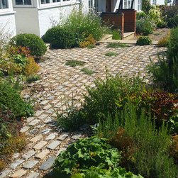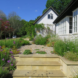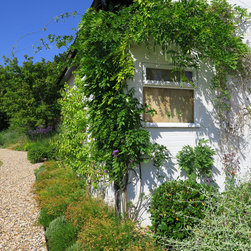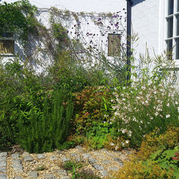 The front of the cottage is a sun trap and much drier than the rest of the garden so here we have made a series of gravel and cobble areas that step down with the cottage and are planted with herbs and Mediterranean species. It has become a perfect place to sit and while away summer weekends.