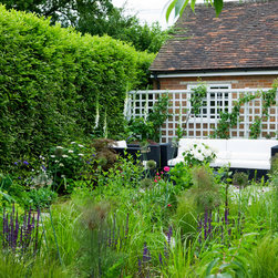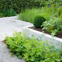 The sunny main terrace close to the house is surrounded by raised beds, planted with Mediterranean plants such as Santolina, lavender and rosemary. From the terrace a short flight of steps leads to a bridge over a small water feature and down through the garden. The path of sandstone with knapped flint, to echo the local vernacular, leads through beds of grasses and perennials to a small gravel area on one side which captures the morning sun and down to the evening terrace. Behind the evening terrace is a trellis with cordon-trained pear and apple trees to screen the garage beyond.