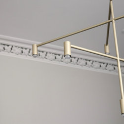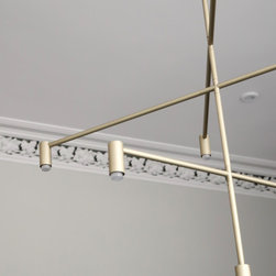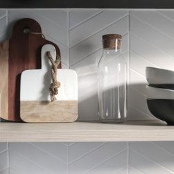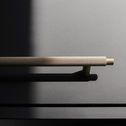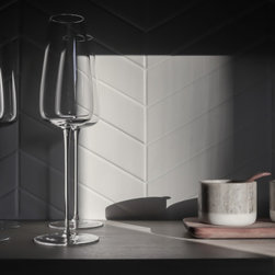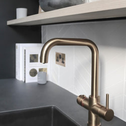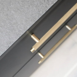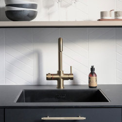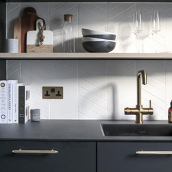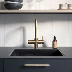 A dark and dramatic kitchen, adorned with brushed brass accents, stands boldly upon a foundation of warm tones and pristine white tiles. Infusing a touch of Scandinavian charm into the classic setting of a traditional Edinburgh property, characterized by its lofty ceilings and preserved original features.