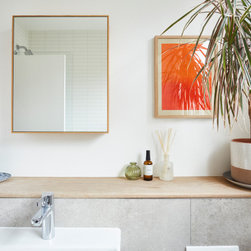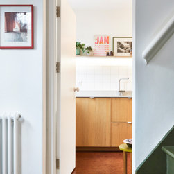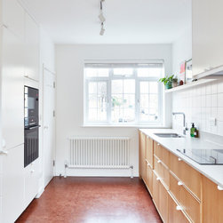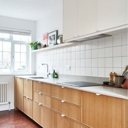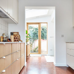Our typical palette of materials and standard products was complemented with additional materials and products including IKEA Ekestad Oak kitchen cabinetry and deep-brown cork flooring.