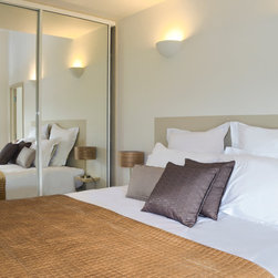 And in the bedroom, a clutter free haven, continuing the subtle colour scheme, with touches of luxury….and a sleek shower room in taupes and blue-greys to complete the seamless look.